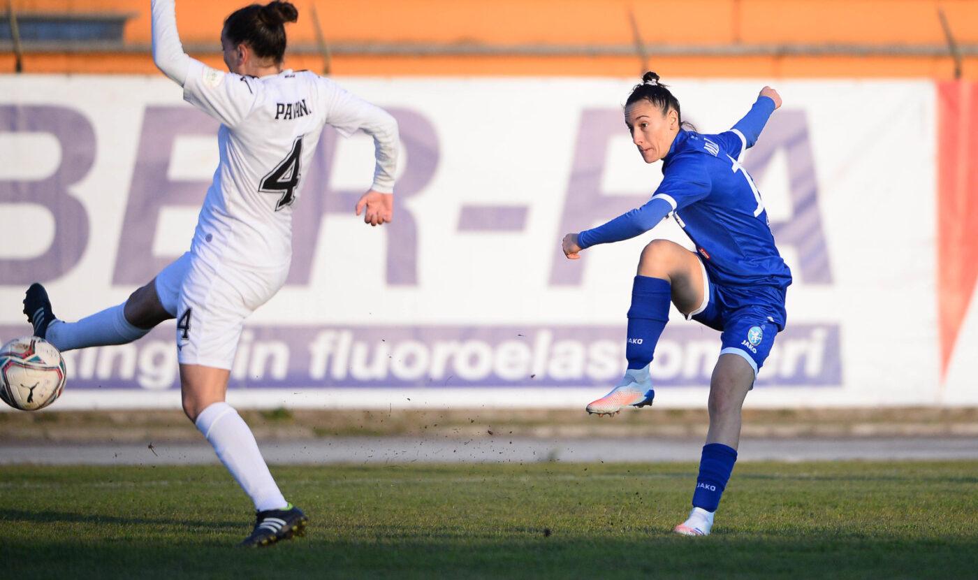 LA GARA – Mister Simone Bragantini schiera il suo Brescia con il 3-4-1-2: Meleddu in porta, difesa con Brevi, Locatelli e Galbiati; centrocampo con Assoni, Barcella, Magri e Farina con Cristina Merli a supporto di Luana Merli e capitan Brayda. Arbitra il signor Selvatici della sezione di Rovigo. Dopo il minuto di raccoglimento per onorare la memoria di Diego Armando Maradona, inizia una vera e propria partita a scacchi con la squadra romagnola: tanta densità in mezzo al campo e lotta su ogni pallone. Le azioni da gol si contano sulle punte delle mani: il primo squillo delle Leonesse è al 13′ con Cristina Merli direttamente da calcio di punizione, pallone alto. Al 15′ si fanno vedere le ospiti con l’ex di giornata, Fabiana Costi: la sua conclusione da posizione decentrata è parata facilmente da Meleddu. Al 28′ ci prova Petralia da palla ferma, pallone alto di poco. Al 33′ occasione da gol per il Brescia: Barcella calcia dal cuore dell’area sul cross di Brayda ma Pignagnoli si salva in corner. Al 42′ Cristina Merli cerca il gol olimpico direttamente da corner, Pignagnoli smanaccia e toglie il pallone dalla porta.